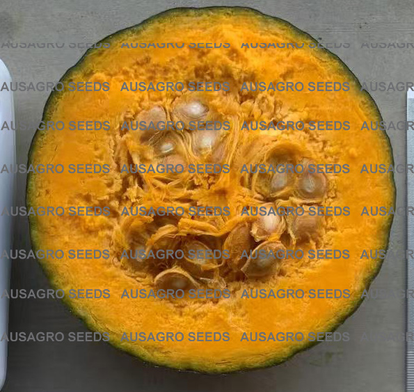 The outer skin is blackish green in colour. Strong fruit setting, The pumpkin is attractive with nice glossiness. The flesh is orange yellow in colour. Thick flesh, the flesh has nice powdery teture., good aroma. The flesh is 300 – 700 gram in average. The fruit is larger in size then Blackbaby F1.
